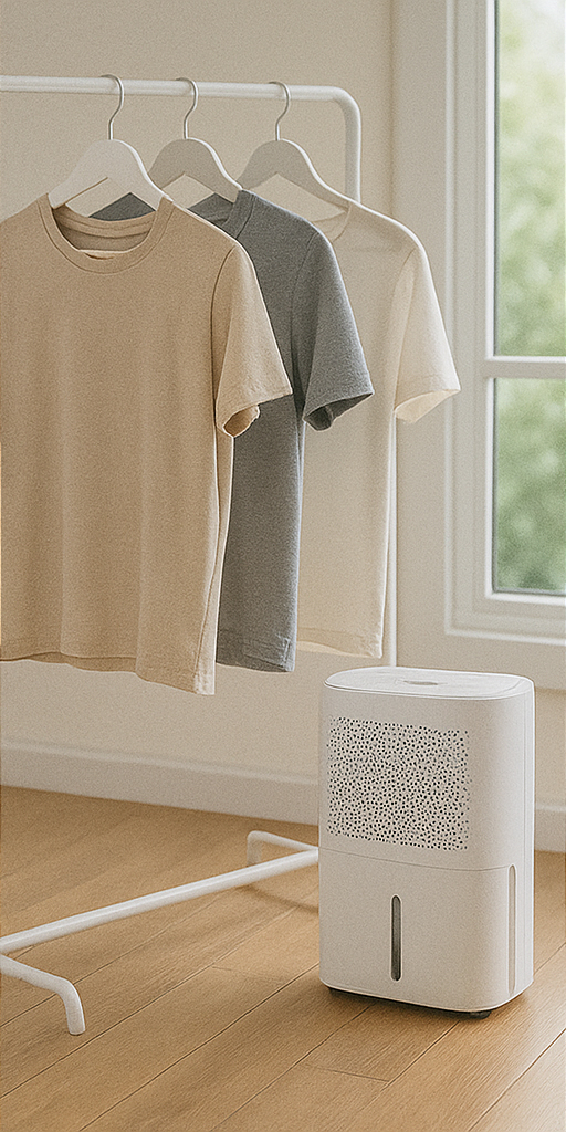 제습기와 건조대를 함께 사용하면 옷이 냄새나지 않고 뽀송하게 유지됩니다.